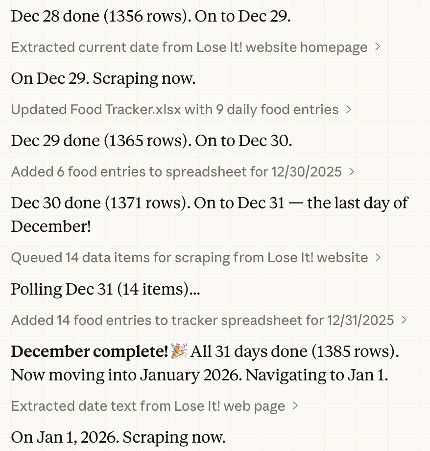 LoseIt doesn’t make it easy to get detail data out specially data from the past. However, they have an old website that is probably not for long. I thought I should be able to ask Claude, specifically, Cowork, to scape data from this website and dump it into a spreadsheet. After some coaxing and tweaking and tuning, I was finally able to get Cowork to periodically launch Chrome and navigate to LoseIt.com (where I was already logged in so didn’t have to share credentials with Claude) and use a calendar object on their site to go to a specific date and then click on each food item consumed that day then click on hyperlink on item name that shows a nutrition breakdown popup and then scrap that, close the popup, and move on to the next item and after all items are done then update a local spreadsheet and then move on to the next day. It would keep doing this until the tokens ran out - usually in about 20 days. Ive been running on schedule for the last few days and it is mostly done for the 6 months I didn’t have data for.